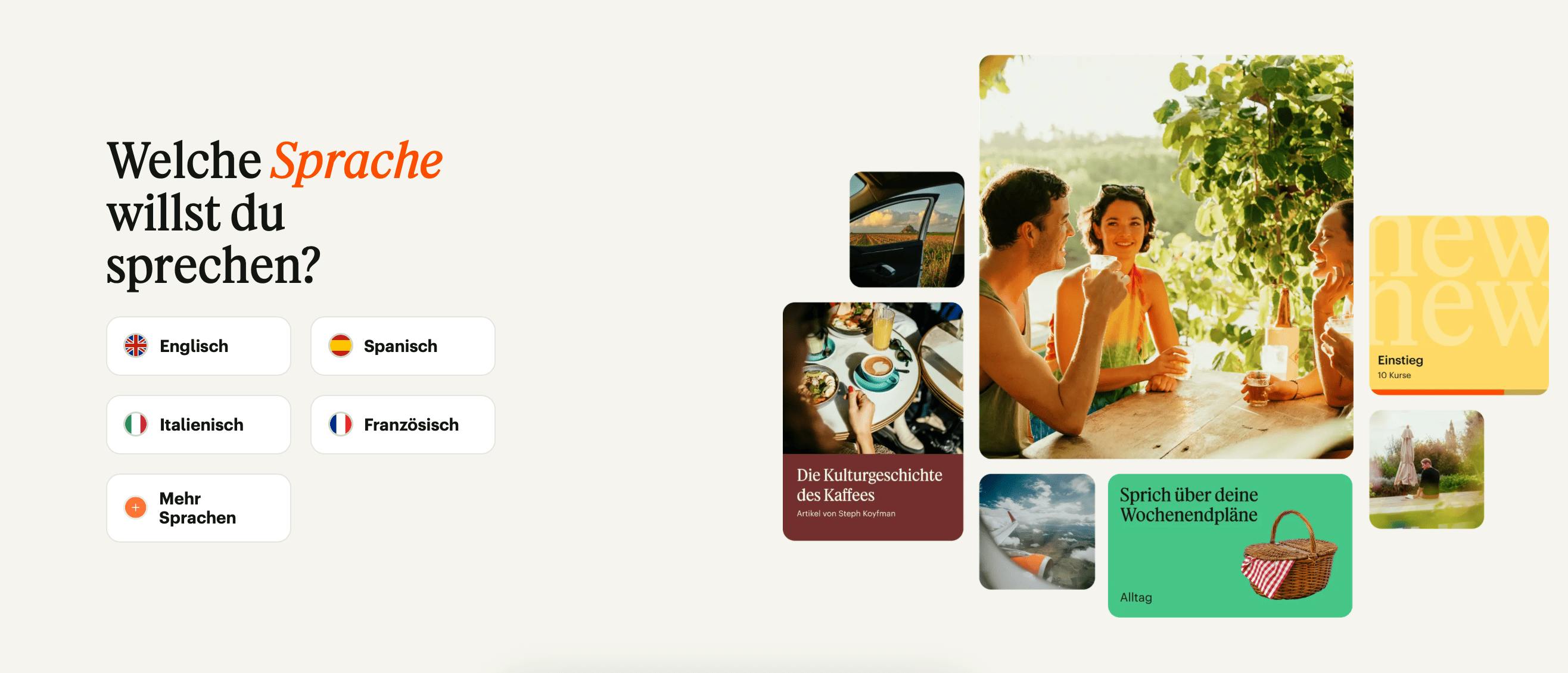 Babbel bietet die Möglichkeit, zwischen 14 verschiedenen Sprachen zu wählen, darunter Englisch, Französisch, Italienisch, Spanisch, Deutsch, Portugiesisch, Schwedisch, Türkisch, Niederländisch, Russisch und vier weitere Sprachen.