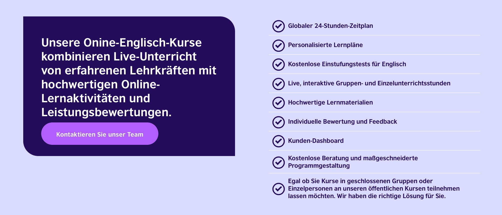 Du kannst an 55-minütigen Gruppenunterrichtsstunden mit maximal 10 Schülern, 25-minütigen Privatstunden und kostenlosen 25-minütigen Webinaren zu Grammatik oder Aussprache teilnehmen.