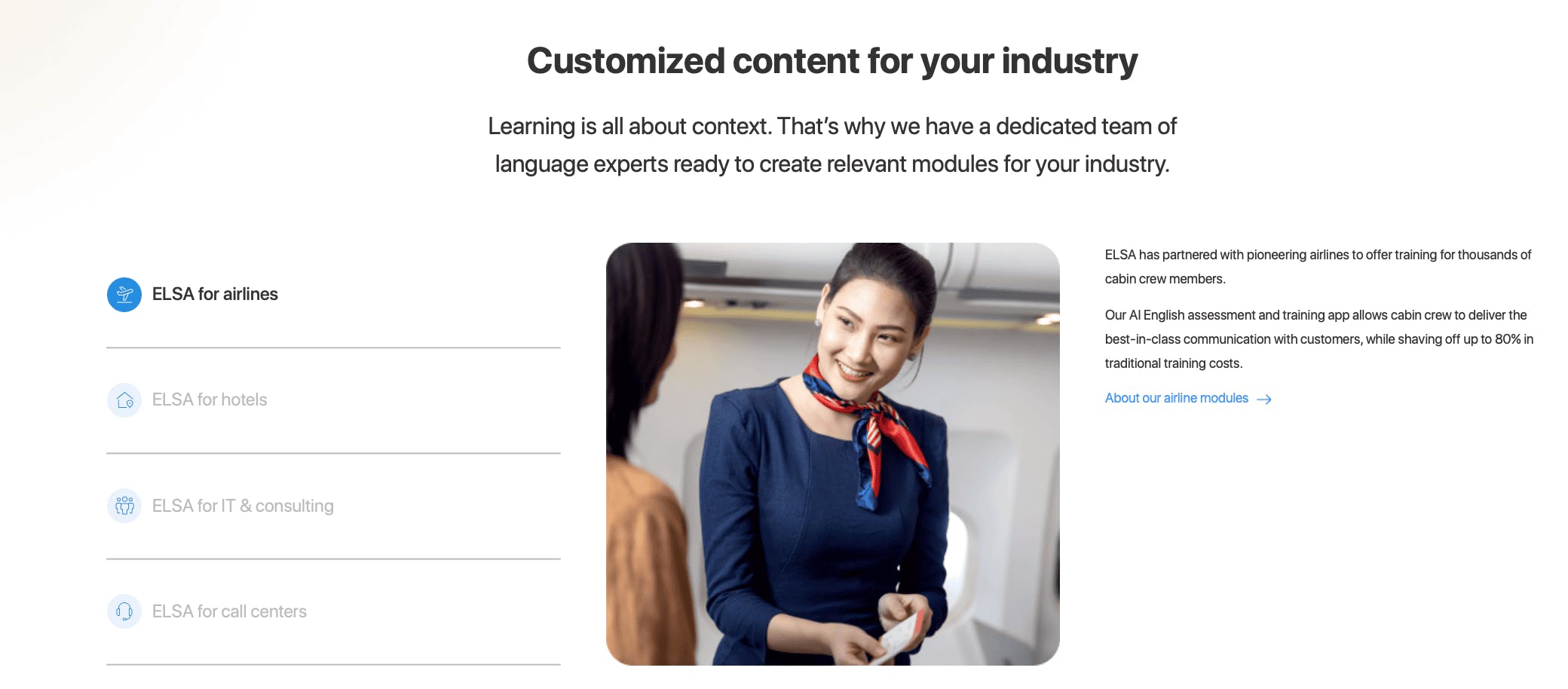 Diese App bietet Englischprodukte für Unternehmen zur Schulung ihrer Mitarbeiter. ELSA fungiert als künstlich intelligenter Englischlehrer für jeden Mitarbeiter und verspricht, dass die Mitarbeiter ihr Englisch innerhalb von drei Monaten ohne Unterricht verbessern können.