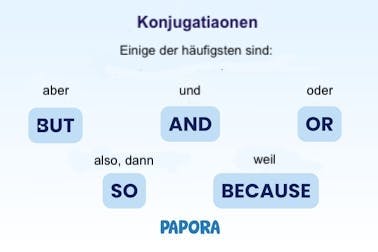Einige der häufigsten Konjunktionen sind „and“ (und), „because“ (weil), „but“ (aber), „or“ (oder) und „so“ (also oder dann).