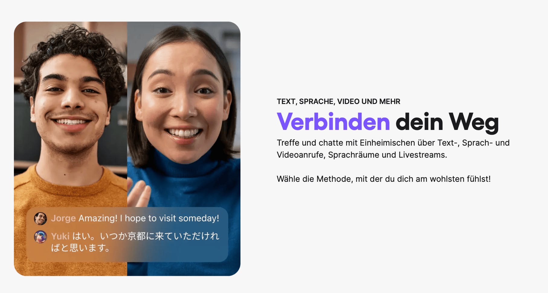 Die Idee dahinter ist, dass sich beide Personen gegenseitig die Sprache beibringen können, indem sie sich über alltägliche Themen wie Sport auf Englisch oder wie man die Uhrzeit auf Englisch sagt unterhalten.