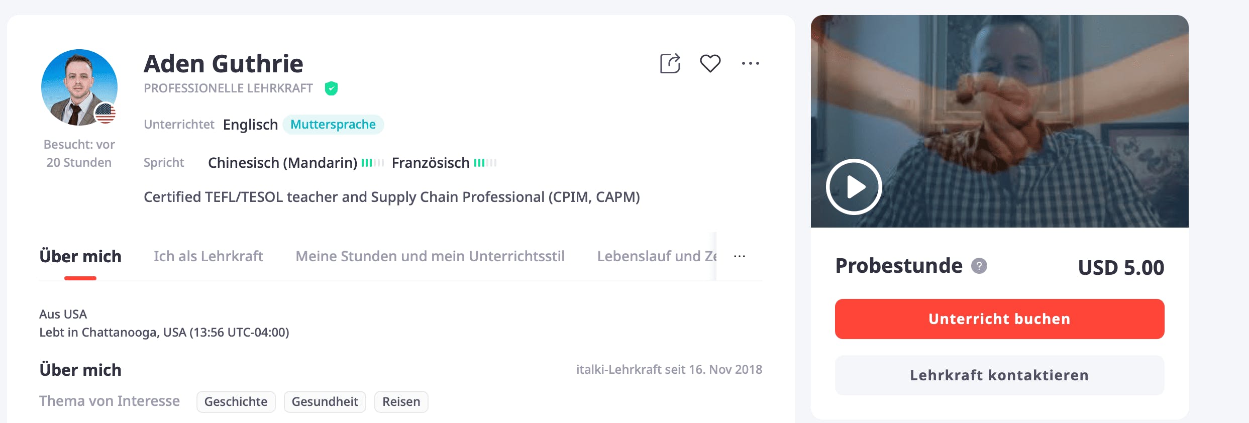 Wenn Sie auf das Profil eines Lehrers klicken, sehen Sie, dass die meisten erklären, was sie anbieten, welche Erfahrungen sie in diesem Bereich haben und was Sie beim Lernen mit ihnen beachten sollten, ob sie Muttersprachler sind und welche anderen Sprachen sie sprechen.