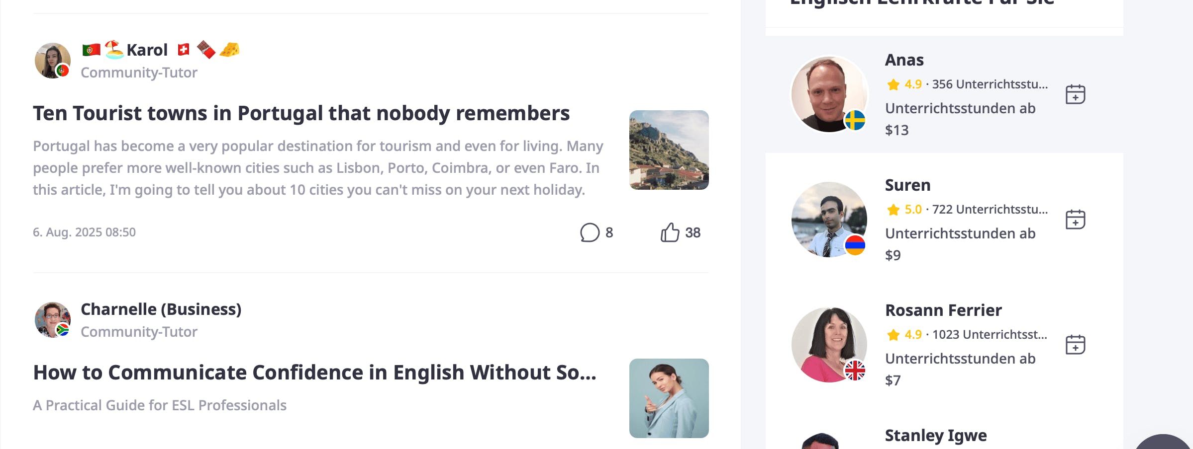 Anschließend sehen Sie in Ihrem Dashboard eine Übersicht der Lehrer, die diese Sprache unterrichten, und haben die Möglichkeit, mit einigen von ihnen Probestunden zu vereinbaren.