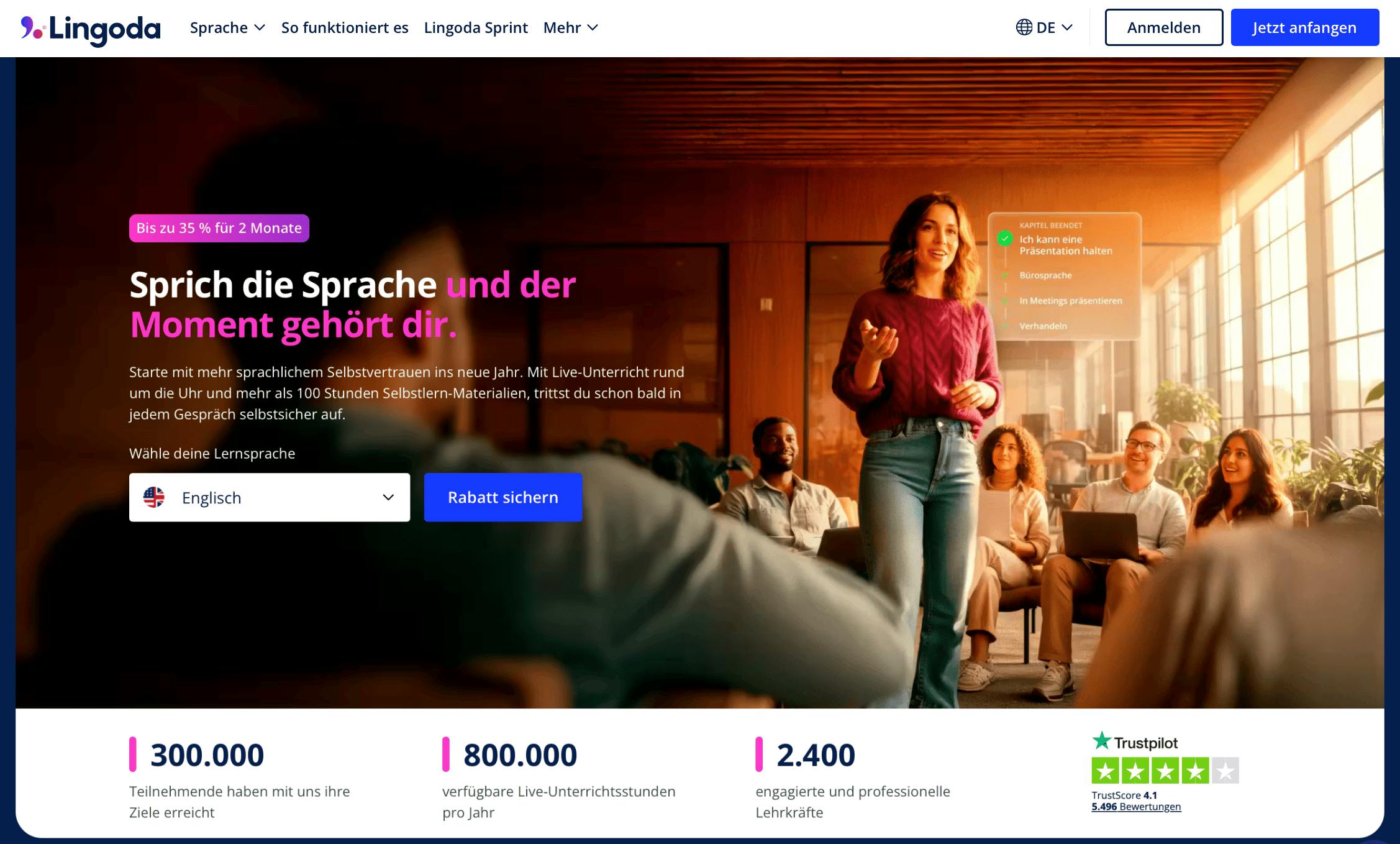 Lingoda bietet Live-Onlineunterricht in kleinen Gruppen oder im Einzelunterricht an. Die Stunden finden rund um die Uhr statt, sodass sich der Kurs gut in verschiedene Alltagssituationen integrieren lässt. Unterrichtet wird von qualifizierten Lehrkräften, meist Muttersprachlern. Das Lernen ist strukturiert, mit klaren Lernzielen und passenden Materialien. Besonders geeignet ist Lingoda für Lernende, die viel sprechen möchten und echte Interaktion brauchen.