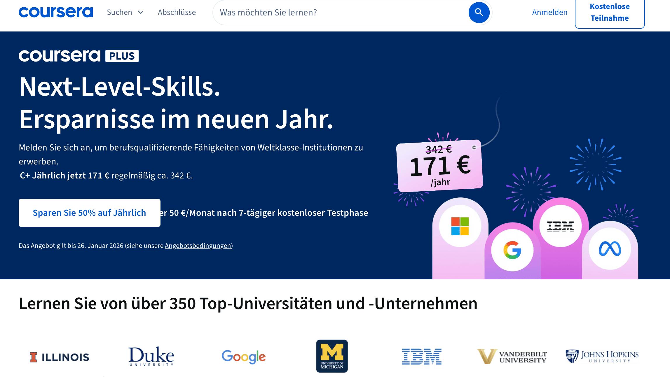 | Coursera | Entwickeln Sie berufliche Fähigkeiten mit Zertifizierungen. |
