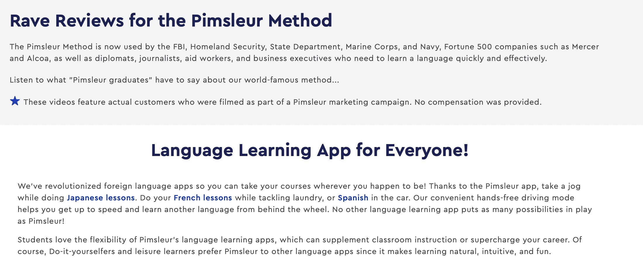 Man kann sagen, dass Pimsleur eine geeignete Lernmethode anbietet, die jedoch größtenteils nur für die grundlegendsten Niveaustufen geeignet ist. Aufgrund der hohen Kosten und Mängel in der Anwendung, insbesondere bei den Zahlungen, hat es viele Beschwerden von seinen Nutzern erhalten, die zudem keinen Unterricht mit echten Lehrern erhalten.