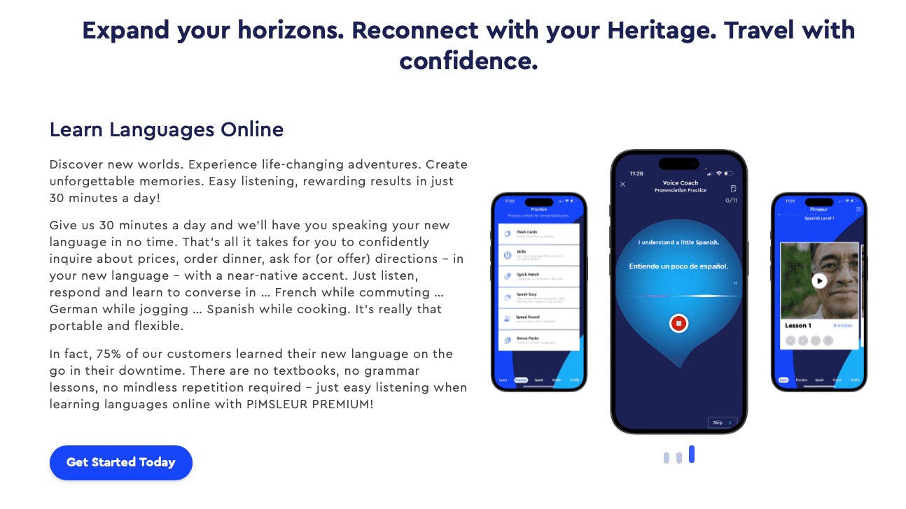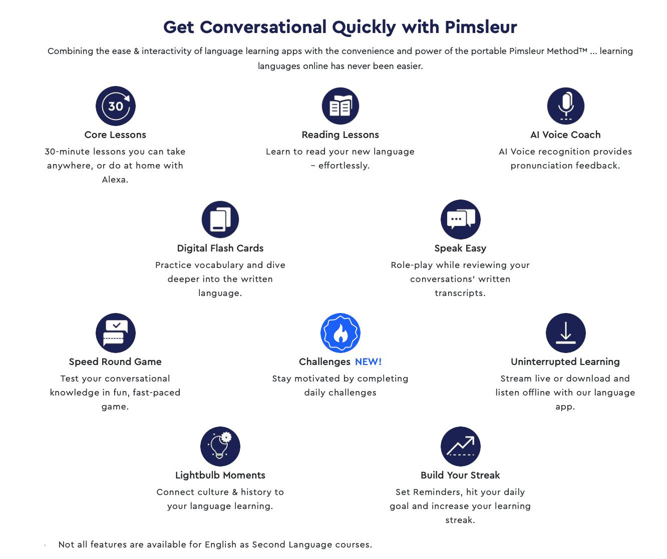 Pimsleur ist eine Online-Plattform und App, die sich auf den Sprachunterricht spezialisiert hat und einen Katalog mit mehr als 50 verschiedenen Optionen umfasst, um sich an die Ziele ihrer Nutzer anzupassen.