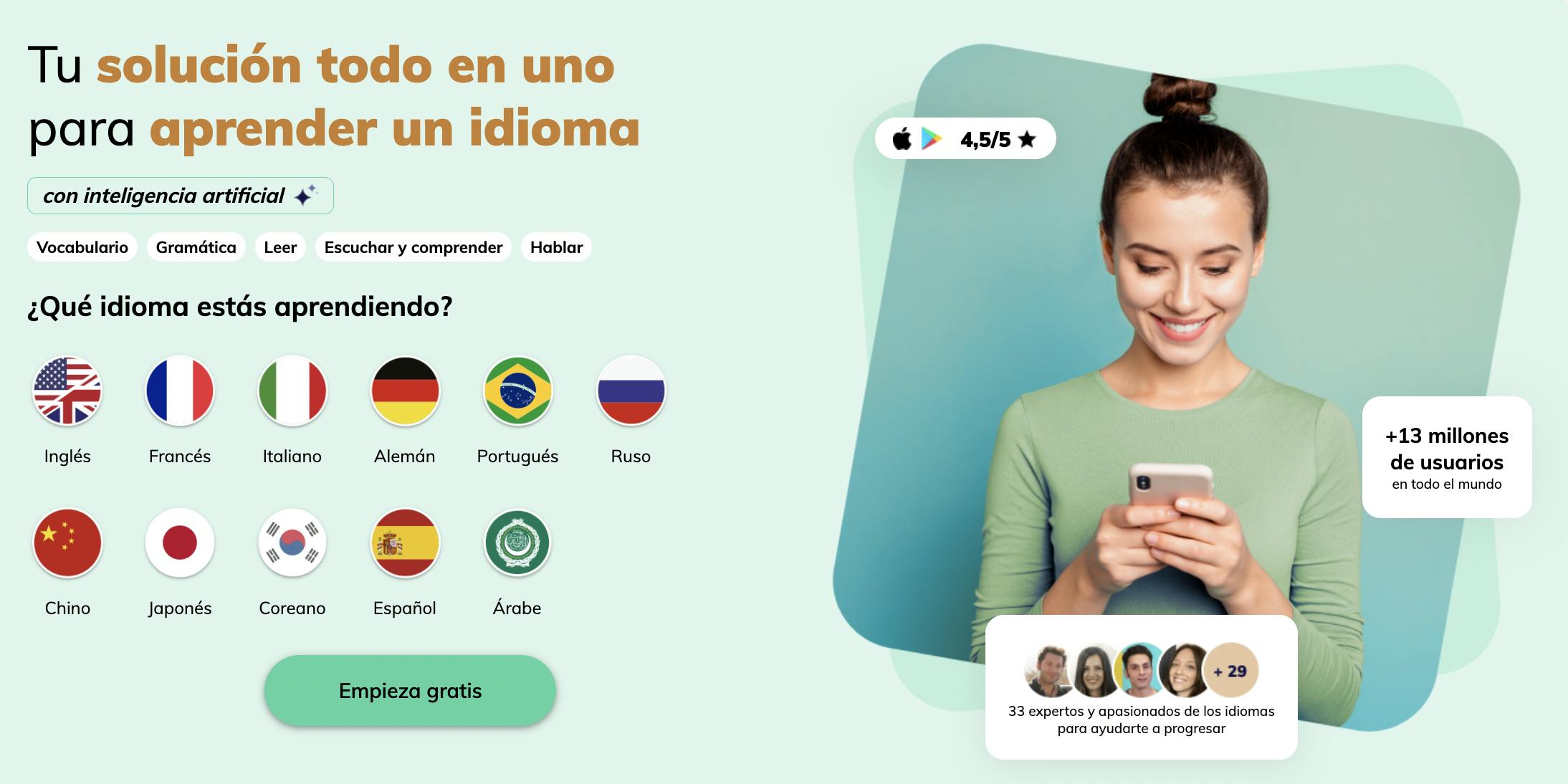 La plataforma ofrece varios cursos con una metodología propia enfocada en enseñar vocabulario y frases importantes del idioma a través de técnicas de repetición espaciada.