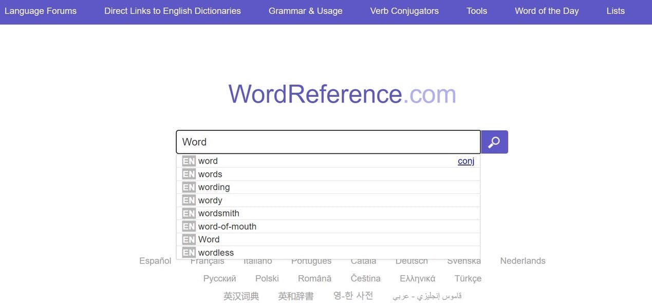 Word Reference no es necesariamente una web para aprender inglés; sin embargo, es una gran herramienta que te servirá como diccionario en donde se mostrarán una lista de las formas en la que se puede buscar la palabra que buscaste y puedes también oírla.