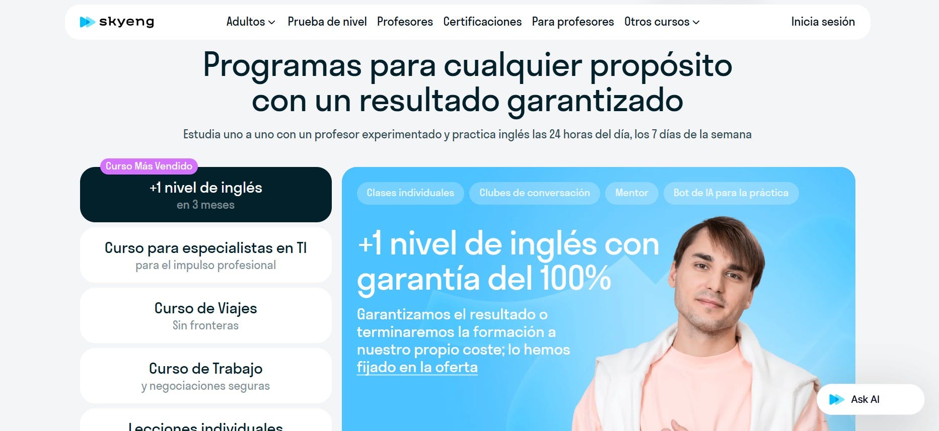 En Skyeng tienen cursos de inglés para negocios y empresas, cursos para viajes, generales y otras opciones específicas según lo que cada uno desee aprender.