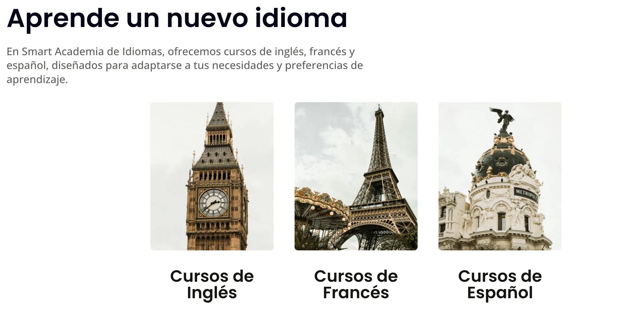 La academia de Smart ofrece cursos presenciales y online para niveles básicos, intermedios, llegando hasta el avanzado C1. También ofrecen un servicio para hacer pruebas internacionales y validar tu nivel de conocimiento.