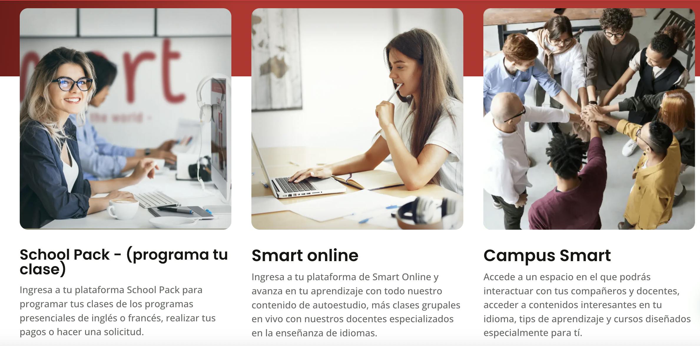 Una característica resaltante de la academia Smart es la variedad de clases que ofrece a sus estudiantes. Actualmente, cuenta con cursos presenciales, una modalidad de clases online, servicios para empresas y la opción de tomar exámenes internacionales.