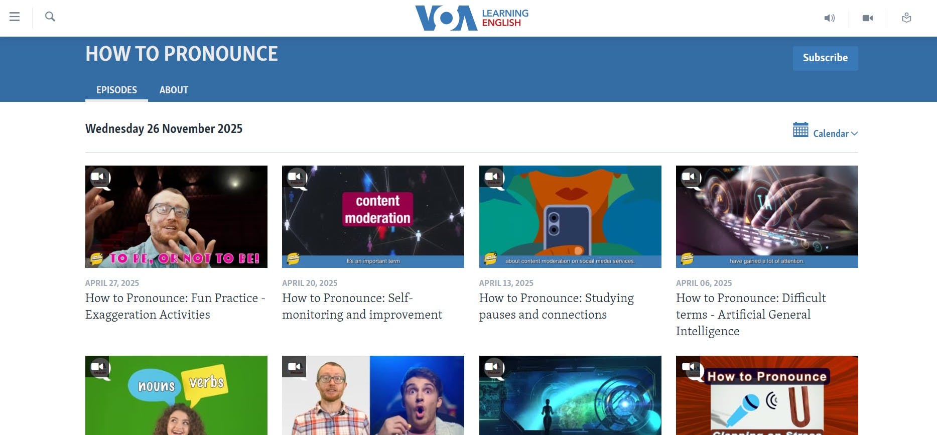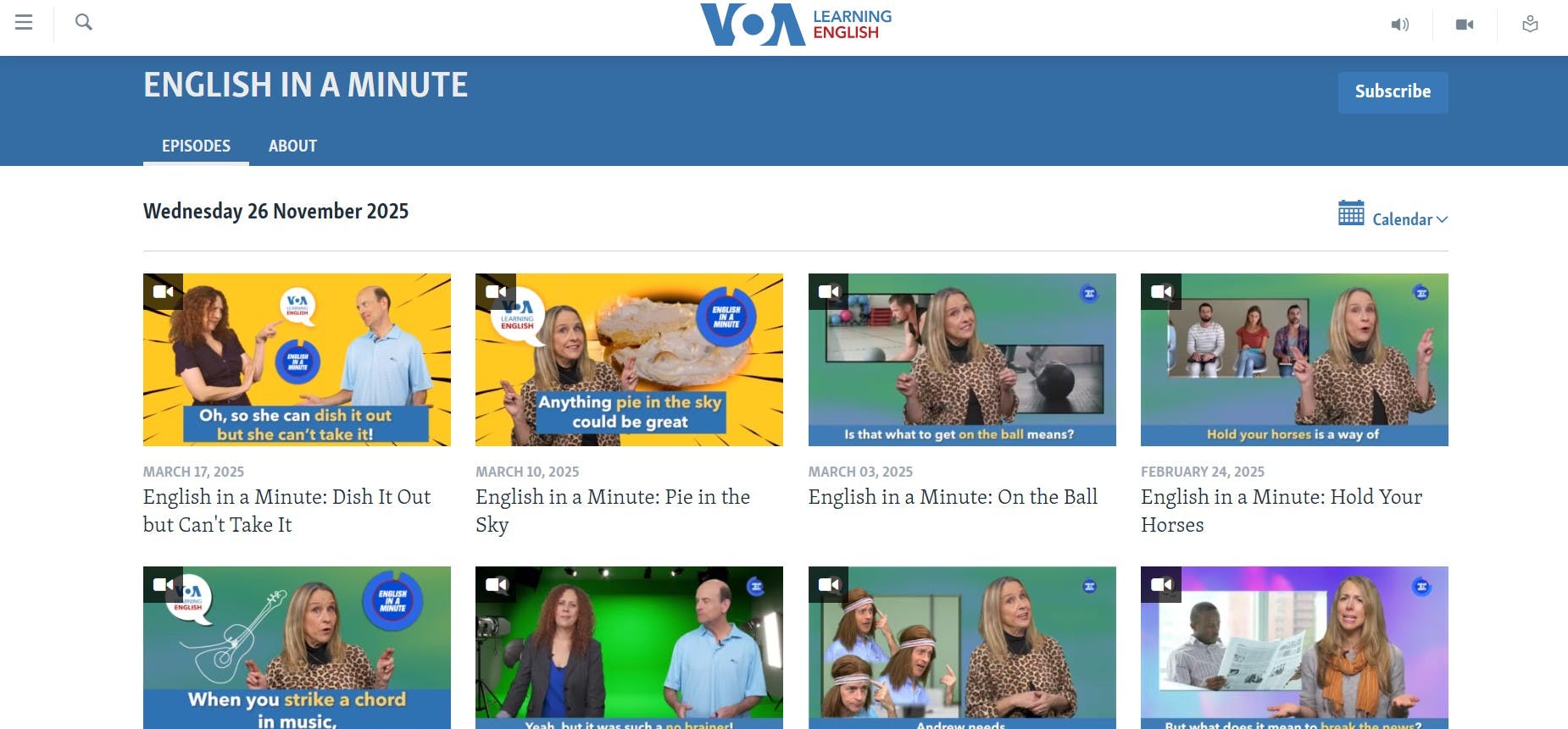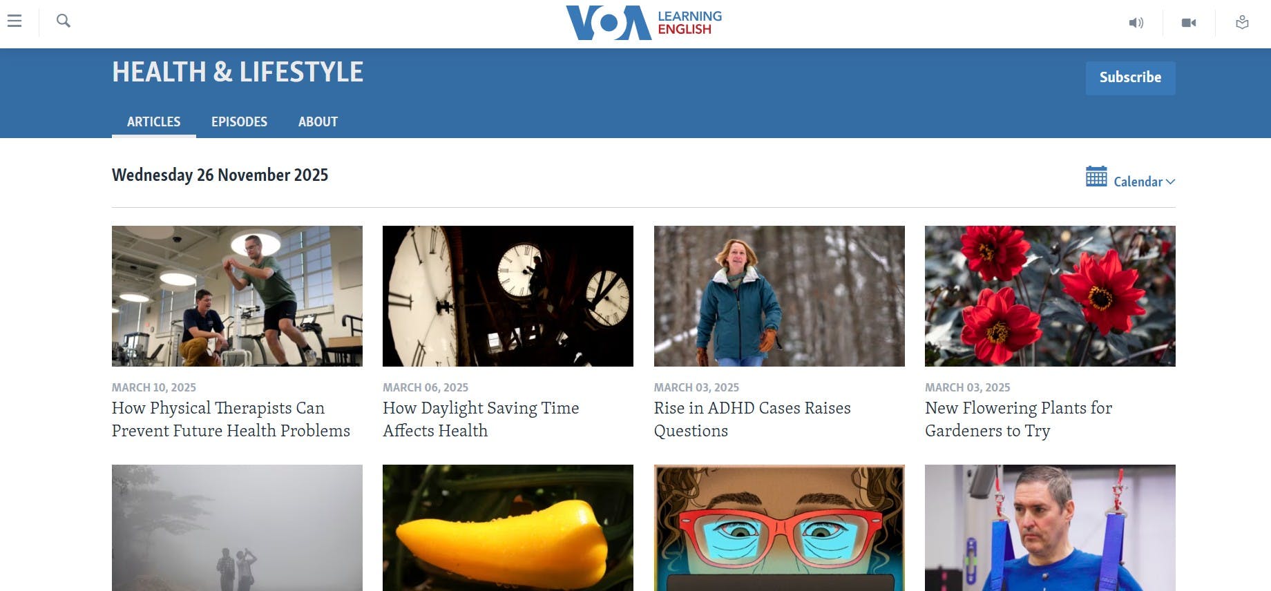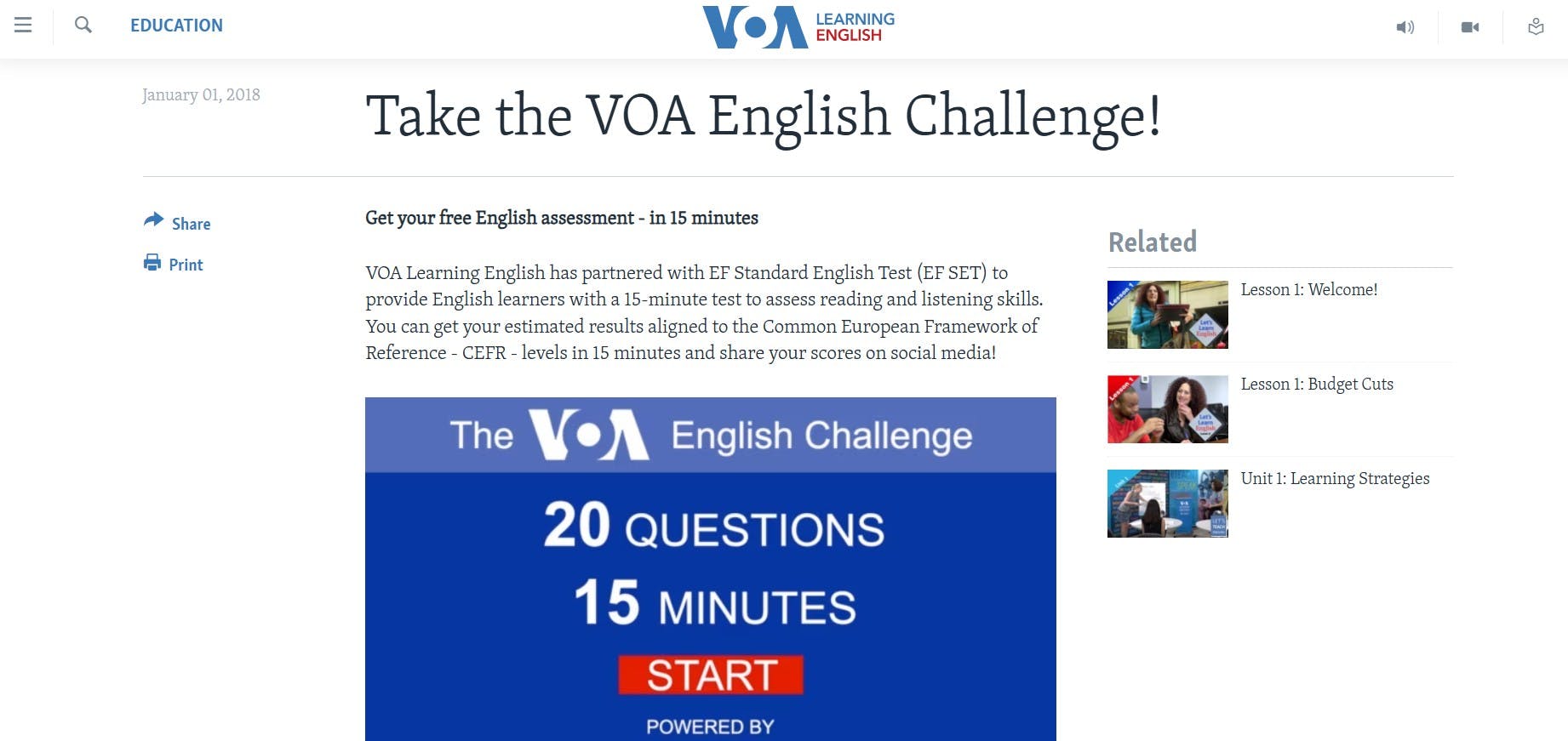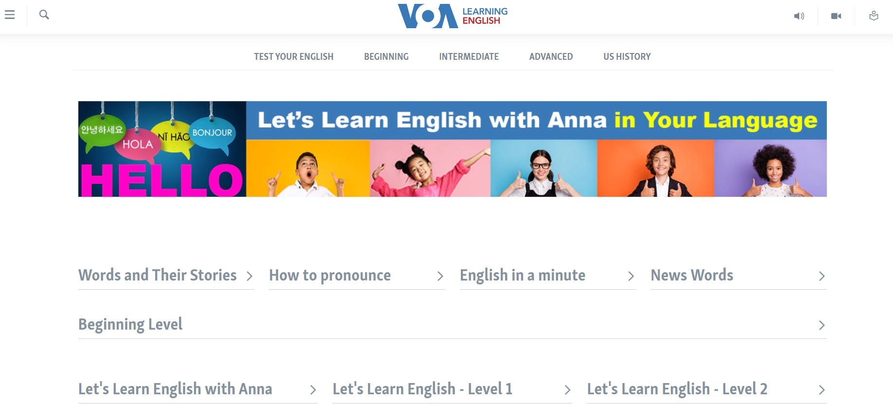 VOA Learning English es una plataforma de contenido multimedia enfocada a la enseñanza de inglés. Iniciaron en 1959 como un programa de radio y se han actualizado hasta ofrecer contenido para diferentes niveles de inglés. Al ingresar allí conseguirás: