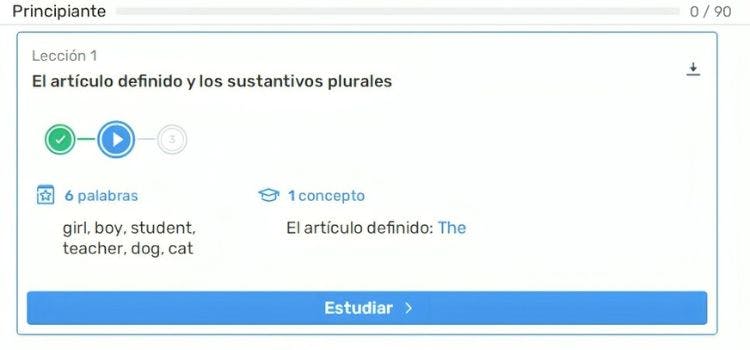 Antes de iniciar la lección, la plataforma te dice cuantas palabras aprenderás y los conceptos gramaticales que quieren enseñar.