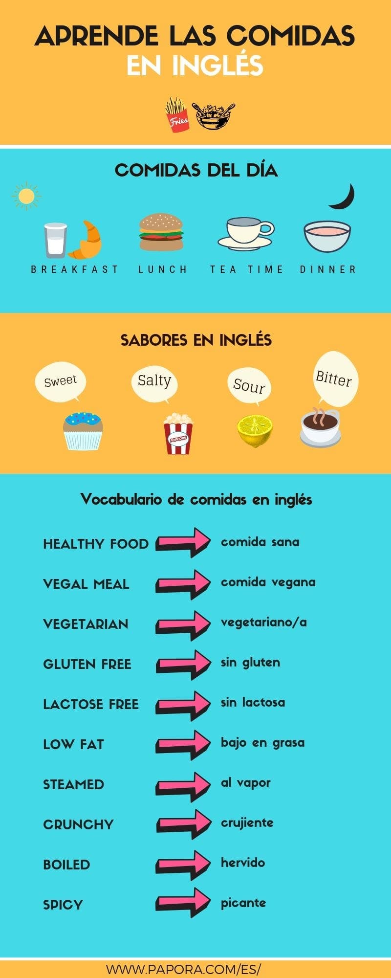 Aquí tienes una infografía a modo de resumen para que aprendas algunas palabras importantes de vocabulario inglés sobre la hora de comer y cenar, los sabores de los alimentos y más.