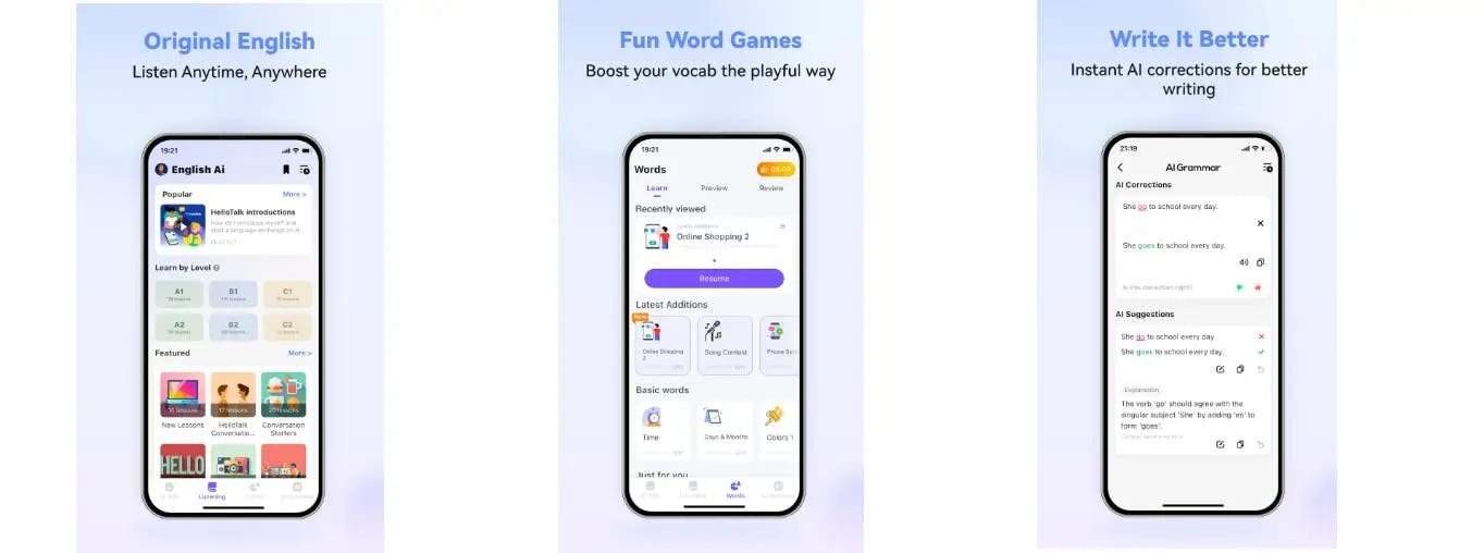 Hello English est conçue pour que l'utilisateur apprenne l'anglais et la grammaire au moyen de nombreux exercices et outils. C'est l'une des applications les plus utilisées dans le monde, disponible sur iOS et Android.