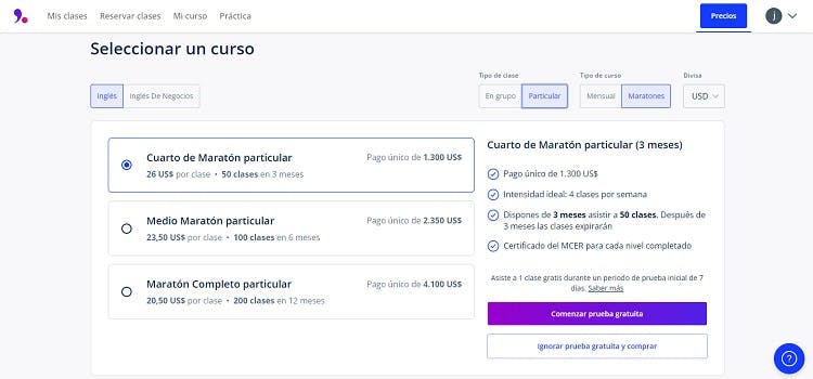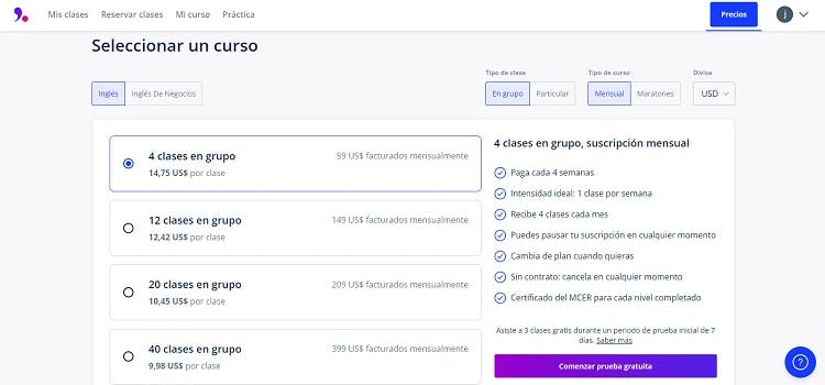 Une fois à l'intérieur, la première chose qui apparaîtra sera une annonce indiquant que vous devez choisir votre plan pour commencer à profiter du cours et choisir entre les cours collectifs ou particuliers. Ils n'ont pas de période d'essai gratuite pour vous permettre de décider si vous aimez ou non la méthodologie.