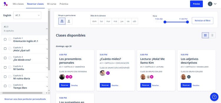 - Réserver des classes : Cette onglet fonctionne comme un calendrier, où vous pouvez vous organiser. De plus, c'est ici que vous décidez justement des horaires et des cours en direct que vous allez réserver. Pour pouvoir réserver, il sera nécessaire d'avoir des crédits.