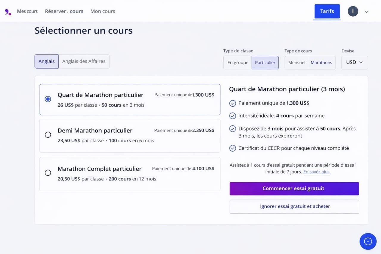 Les paiements mensuels se subdivisent en 4 types de plans différents qui indiquent le nombre de cours que vous pouvez suivre par mois. Cela signifie, le nombre de crédits que vous avez.