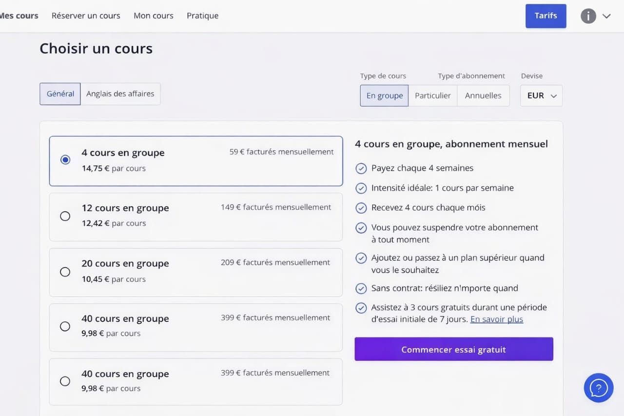Une fois à l'intérieur, la première chose qui apparaîtra sera une annonce indiquant que vous devez choisir votre plan pour commencer à profiter du cours et choisir entre les cours collectifs ou particuliers. Ils n'ont pas de période d'essai gratuite pour vous permettre de décider si vous aimez ou non la méthodologie.