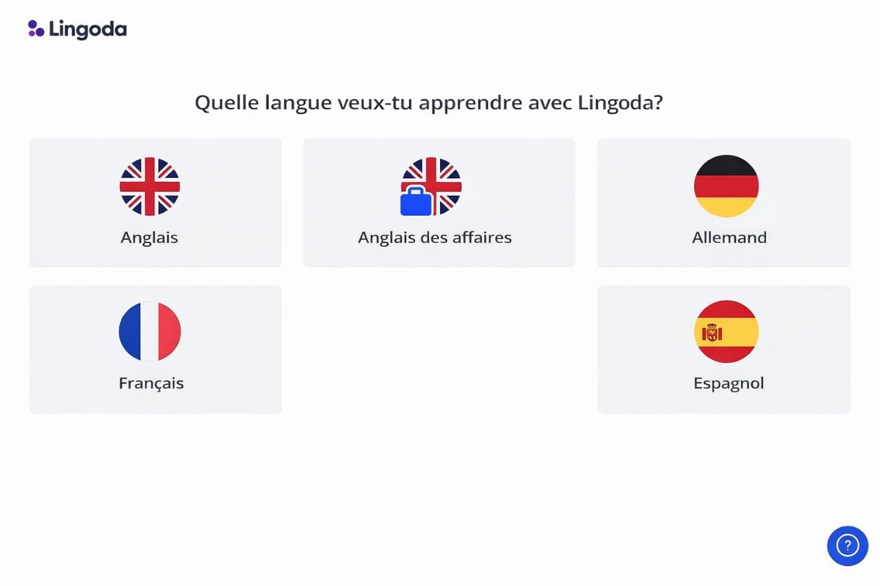 Chez Lingoda, vous pouvez apprendre 4 langues différentes. L'espagnol, l'allemand, le français et l'anglais, ce dernier offrant la possibilité de choisir entre l'anglais général et l'anglais des affaires, vous permettant de spécifier la langue selon vos besoins et objectifs.