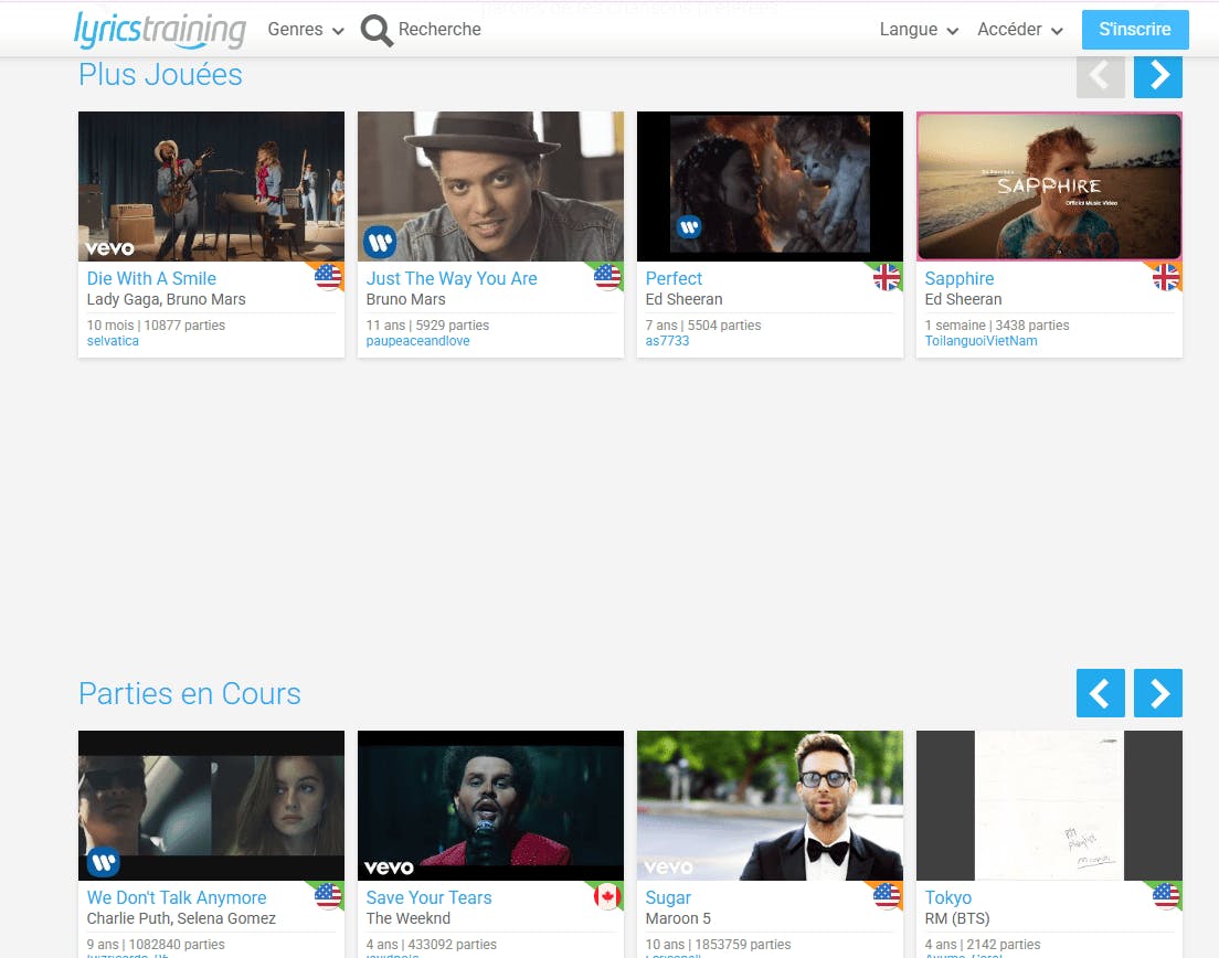 Cependant, des sites comme Lyrics Training ont porté cette méthode à un autre niveau. Vous pouvez y choisir votre chanson préférée, l’écouter tout en suivant les paroles en temps réel, ce qui est idéal pour apprendre l’anglais.