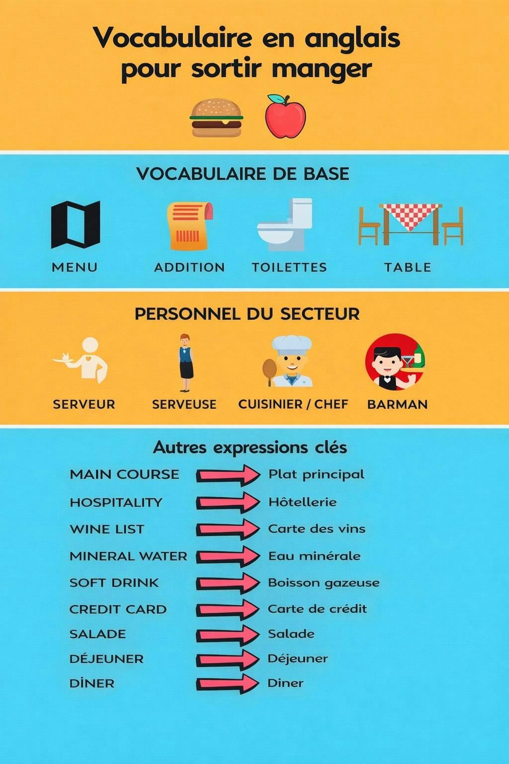 Gardez à l'esprit que la grammaire anglaise est importante, qu'il est essentiel de comprendre des notions telles que l'utilisation du futur simple en anglais, d'avoir une bonne oreille et une bonne prononciation, mais qu'un certain vocabulaire est également indispensable si vous ne voulez pas vous sentir perdu au milieu d'une conversation dans un restaurant en anglais.