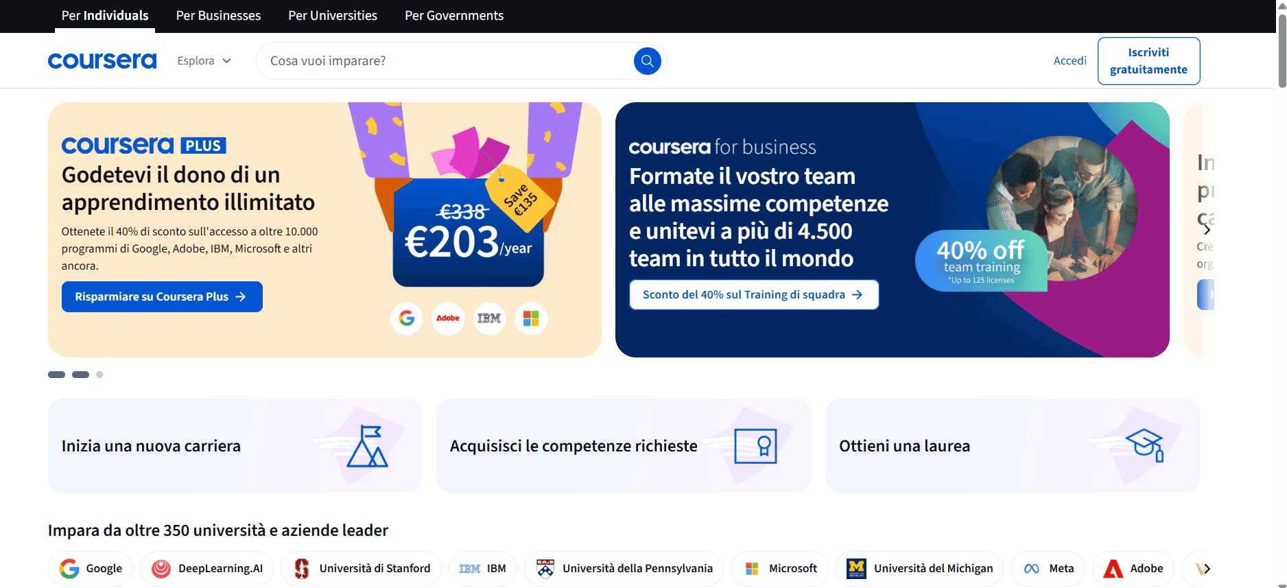 Coursera è un sito web specializzato nella creazione di ogni tipo di corso su diversi argomenti. Nel suo catalogo si possono trovare corsi di inglese base, focalizzati su diverse aree della lingua.