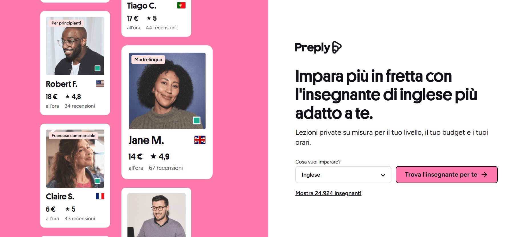 D’altro canto, Preply offre un ampio catalogo di insegnanti tra cui scegliere, con la possibilità di sostituirli facilmente nel caso in cui il loro metodo non sia adatto a te.