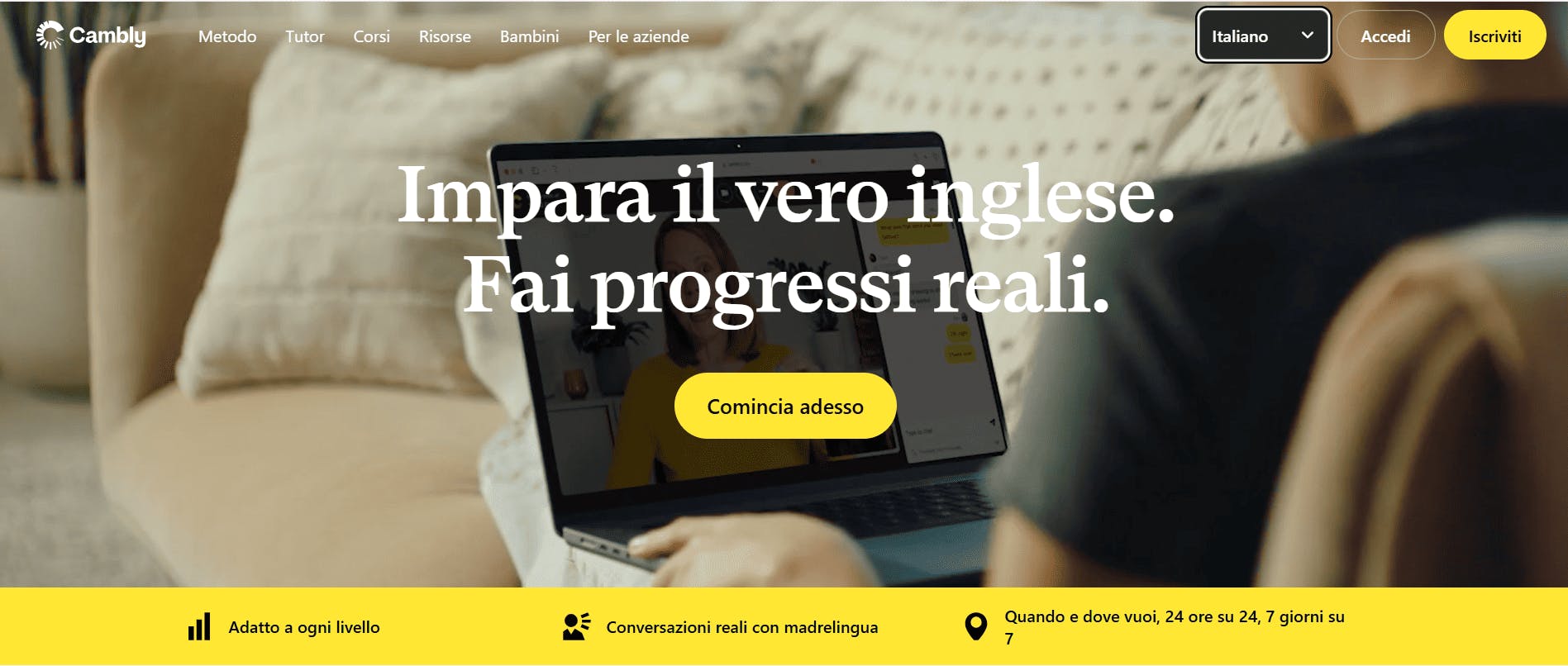 | Cambly | Incentrato sul miglioramento delle competenze comunicative, in particolare la sicurezza nel parlare. | Principiante, intermedio e avanzato. | Abbonamento mensile da $87,48 USD (2 giorni a settimana) o abbonamento annuale da $65,61 USD/mese (2 giorni a settimana). |
