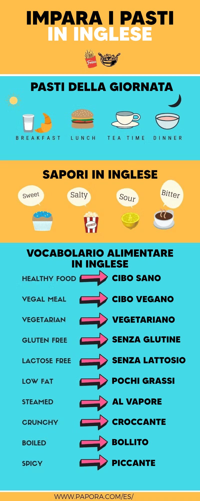 Qui trovi un’infografica riassuntiva per aiutarti a memorizzare alcune parole importanti del vocabolario inglese legate ai pasti, ai sapori del cibo e molto altro.