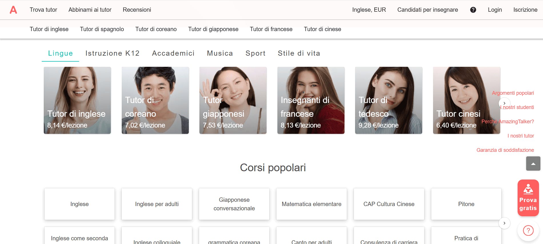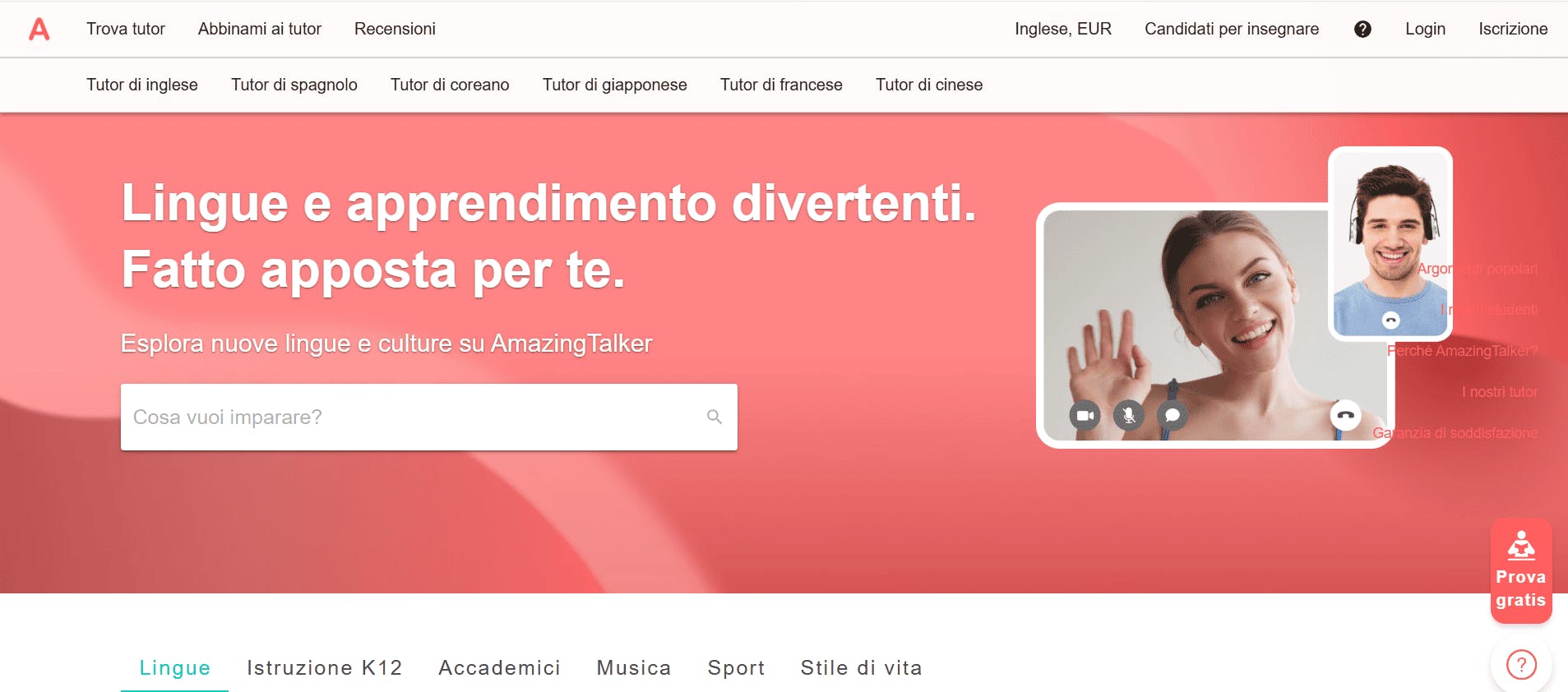 Amazing Talker è una piattaforma online specializzata nell’insegnamento delle lingue. In pratica, mette in contatto studenti con un ampio catalogo di insegnanti, affinché possano scegliere quello che preferiscono e prenotare le lezioni. I prezzi variano in base alla lingua scelta e all’esperienza del tutor.