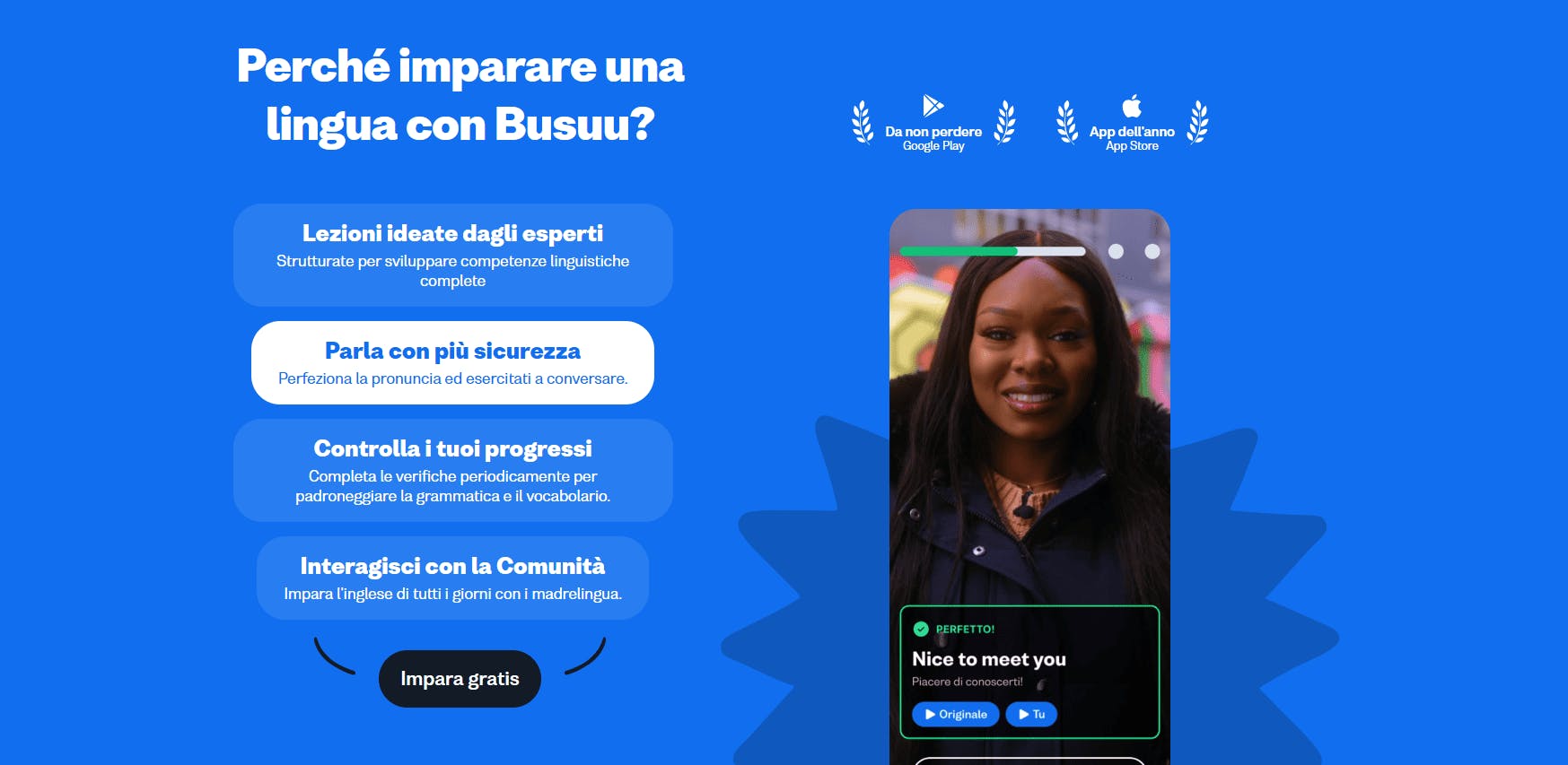 Busuu offre molti dei vantaggi tipici delle app per imparare l’inglese, in particolare la possibilità di studiare al proprio ritmo, da computer o smartphone, superando i limiti dell’apprendimento tradizionale.