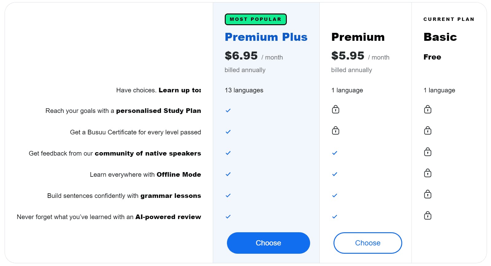 Al momento, Busuu offre 3 piani diversi a seconda dei vari strumenti che desideri utilizzare dell'applicazione; più alto è l'importo mensile che paghi, maggiori saranno i benefici e le opzioni di studio per ogni lezione che avrai.