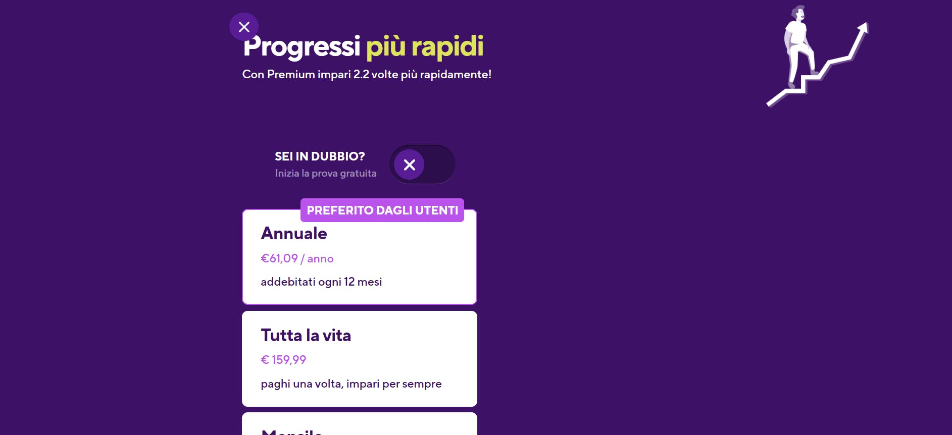 Nella versione gratuita si può accedere alle lezioni solo per cinque minuti, poi bisogna aspettare un po’ di tempo per poter rientrare. Se si sottoscrive la versione Premium, si ha accesso illimitato a tutti gli esercizi e i contenuti dell’applicazione.