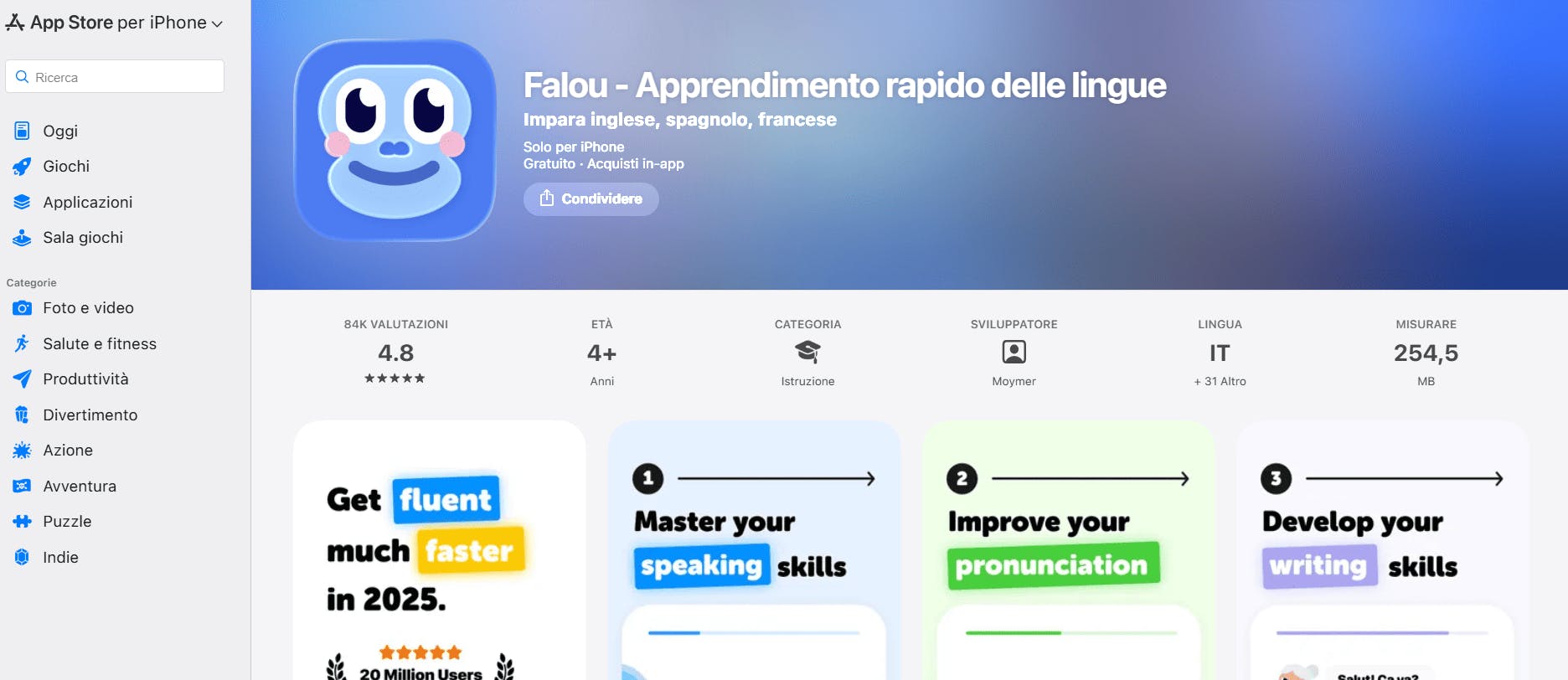 Falou è un'applicazione gratuita che offre l'opportunità di imparare una grande varietà di lingue ed è disponibile per tutte le età.