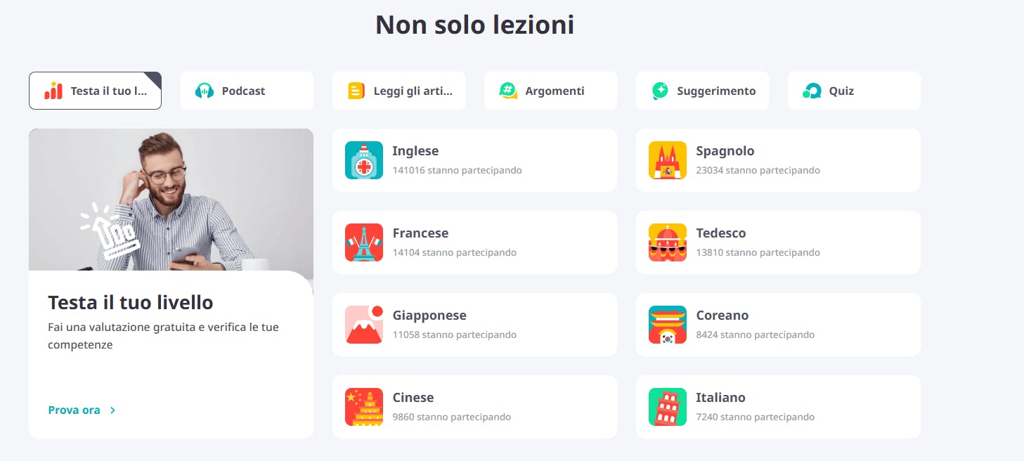Ogni corso è costituito da 10 lezioni che hai l'opportunità di prendere con lo stesso insegnante o con uno diverso. La piattaforma garantisce che tutti i tutor sono madrelingua e promette che riuscirai a migliorare le tue competenze orali e la pronuncia con facilità e rapidità.