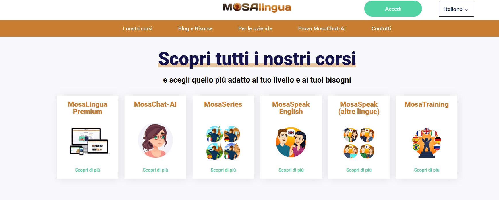 - MosaSeries: Entrambe le serie sono consigliate per studenti principianti (livello A1) e intermedi (dal livello B1). Hanno un costo di €9,98 al mese.