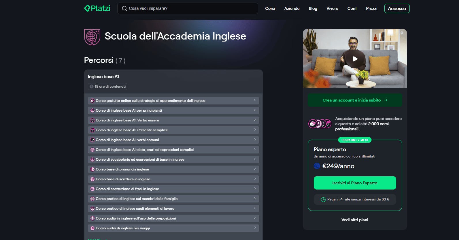 Questa piattaforma ha quattro piani (uno mensile e tre annuali), ma solo abbonandoti ai piani annuali potrai usufruire della English Course, oltre alla possibilità di accedere a tutti gli oltre 1000 corsi e 21 scuole della piattaforma.