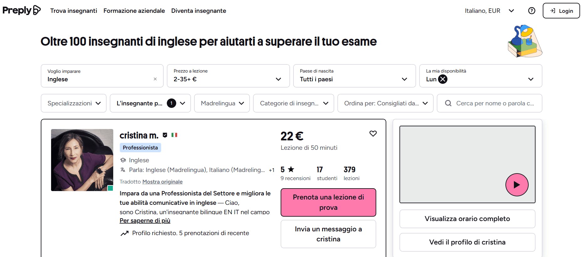 Devi tenere presente che ci sono persone che si concentrano sull'insegnamento dell'inglese e altre che lavorano solo per prepararti agli esami ufficiali di inglese. Se ti stai chiedendo come imparare l'inglese in modo personalizzato, Preply ti offre la flessibilità di scegliere un tutor che adatti le lezioni alle tue esigenze specifiche.