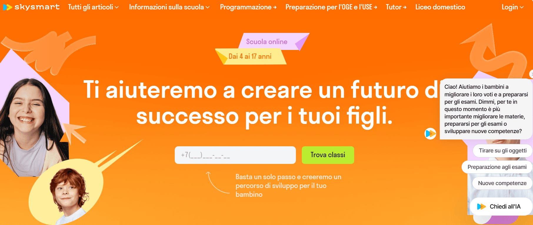 La categoria di apprendimento per bambini di Skyeng offre opzioni dai 4 anni fino ai 17, insegnando cose basilari come i saluti in inglese fino ad argomenti un po' più complessi, soprattutto perché hanno bisogno di imparare l'inglese da zero.