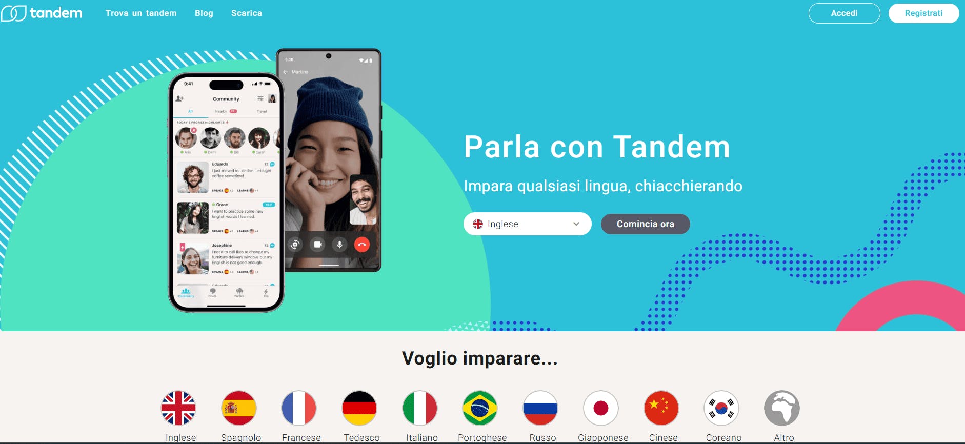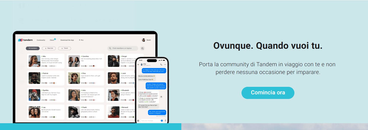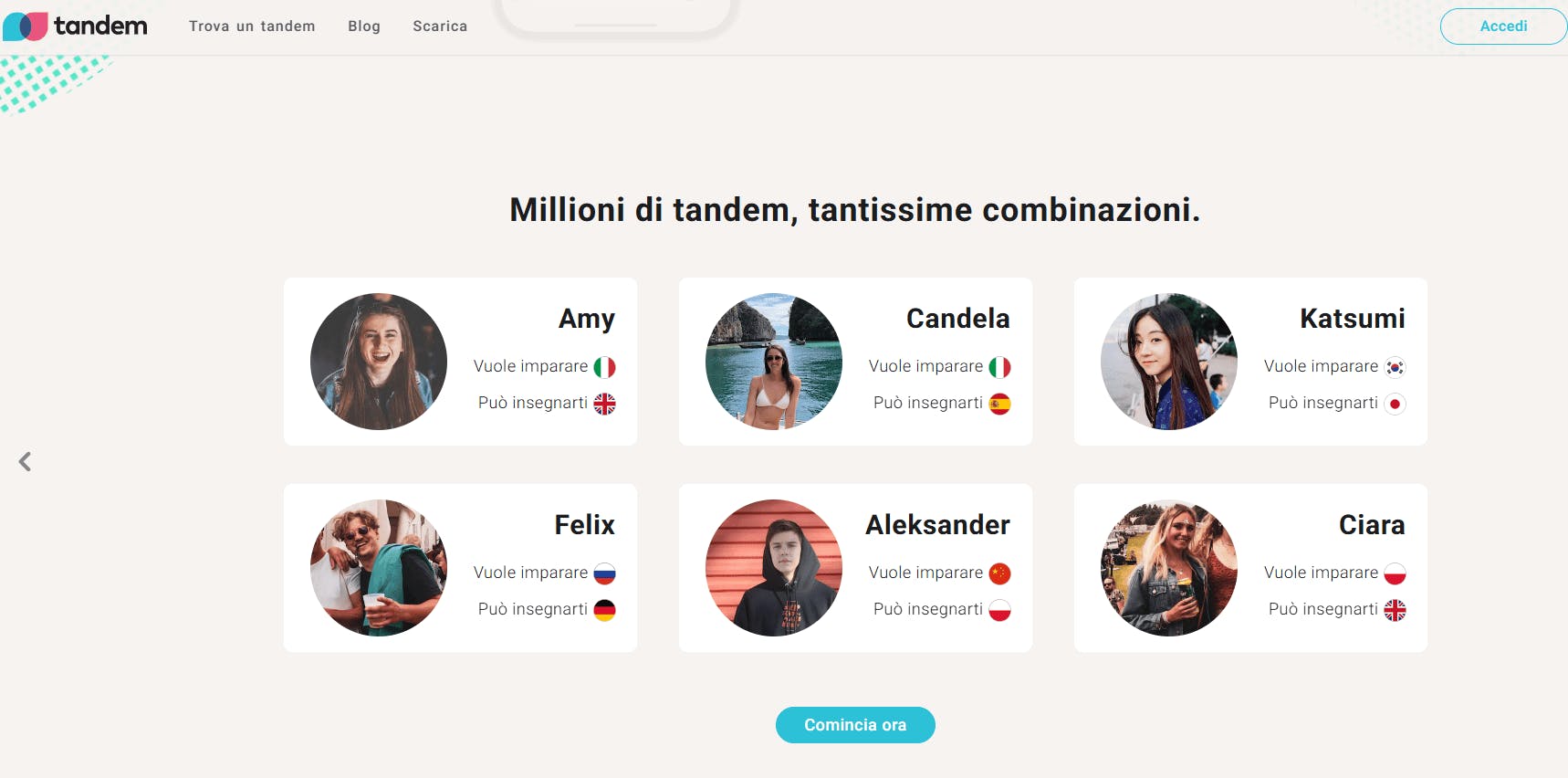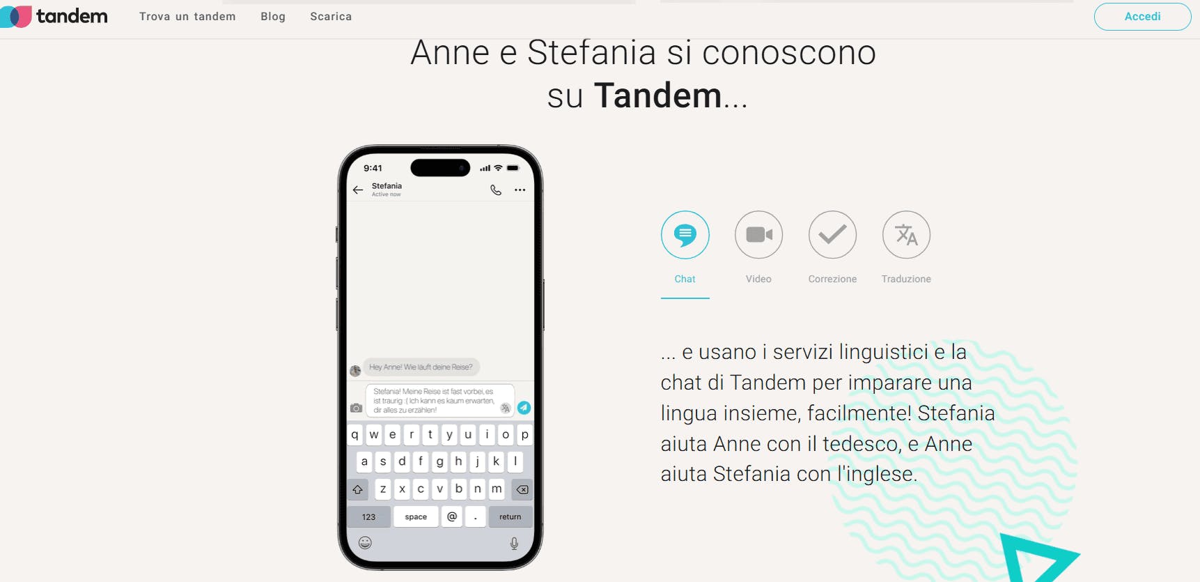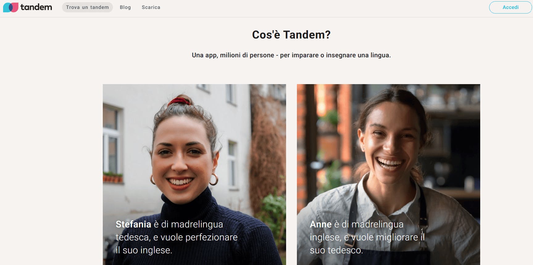 Tandem è un'app di scambio linguistico creata nel 2015 con l'intento di connettere persone di tutto il mondo che vogliono imparare inglese, francese, tedesco, italiano, mandarino, tra molte altre lingue.