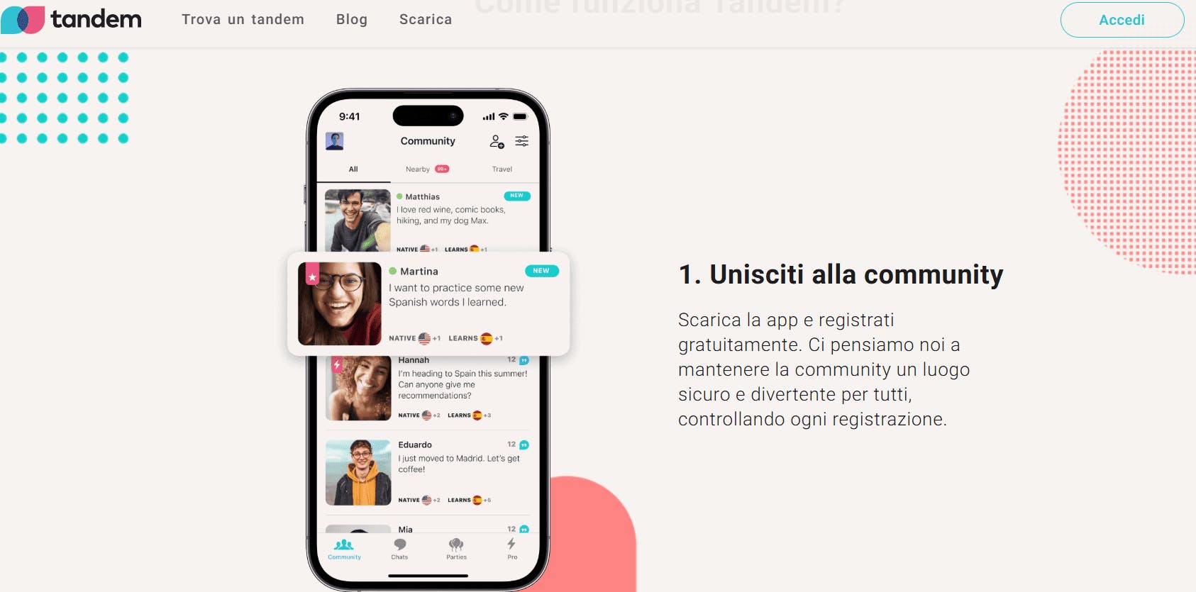 Tandem offre un servizio molto interessante, poiché ti consente di parlare direttamente con madrelingua che possono insegnarti l'inglese autentico.