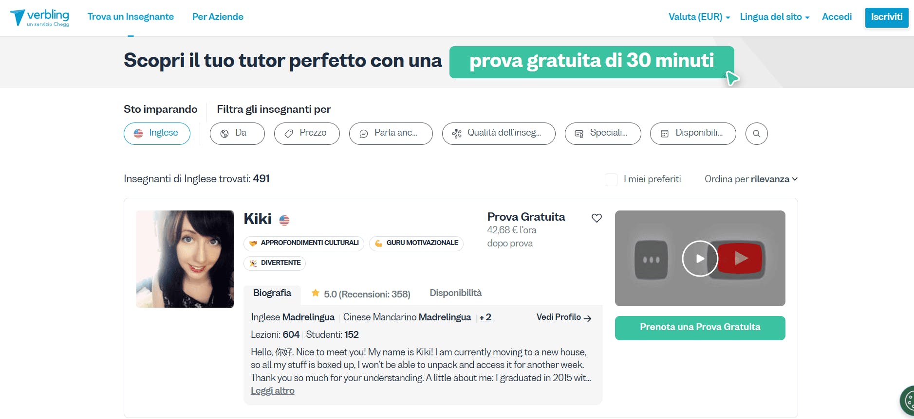 Anche se può essere utile per gli orari, il fatto che ci siano così tanti insegnanti registrati rende molto difficile trovare uno che si adatti alle tue esigenze e con cui tu possa andare d’accordo. Dovrai fare molte prove e controllare molti profili.