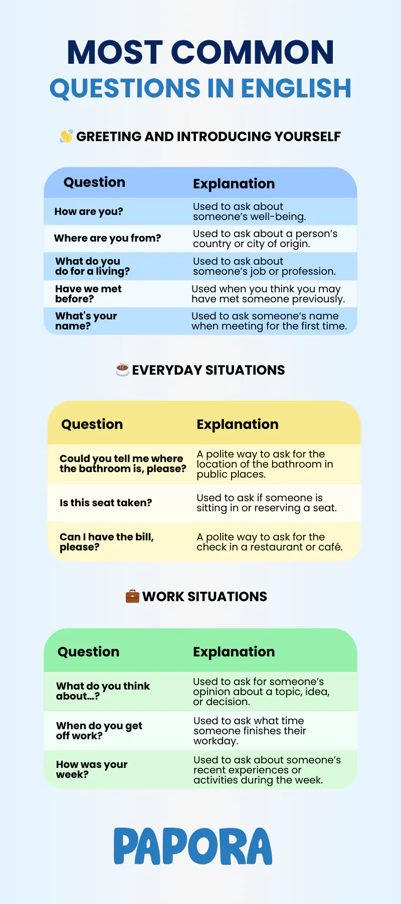 Below, you can see a visual summary of some of the most frequently asked questions in English for real-life situations.