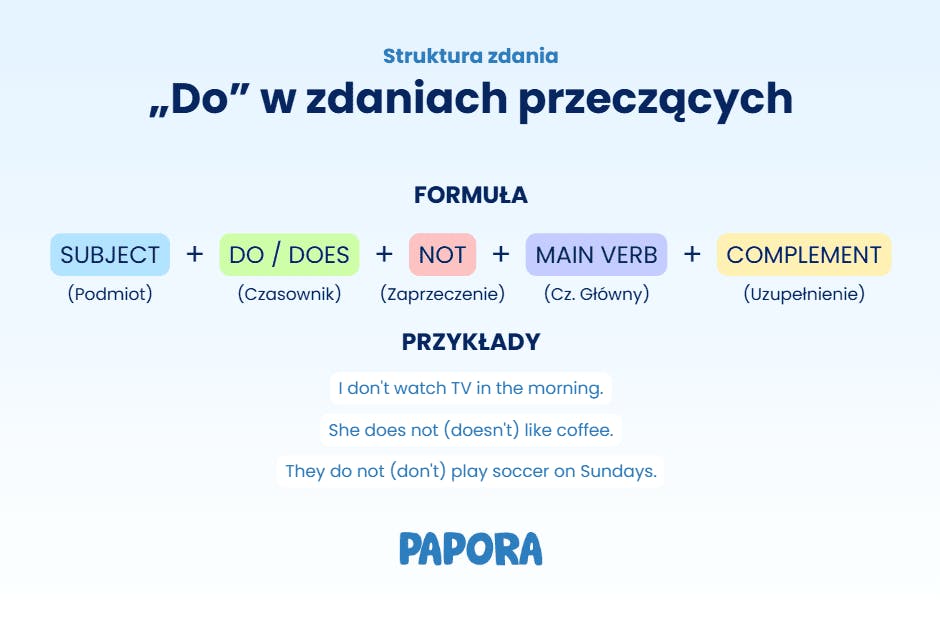 W zdaniach przeczących czasownik do not/does not pozwala nam zanegować czas teraźniejszy prosty i jest używany specjalnie do zanegowania czynności czasownika głównego w zdaniu.