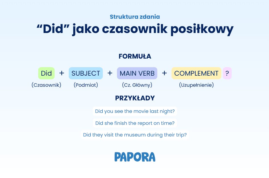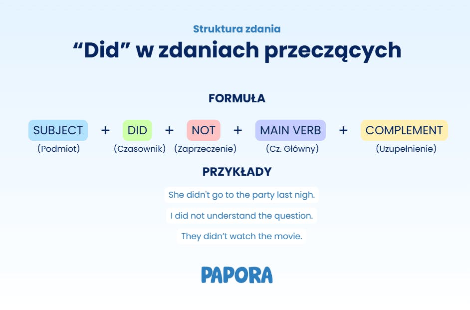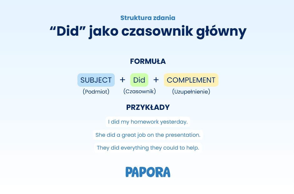 W czasie Past Simple „do” i „does” stają się po prostu „Did”, a ten czasownik posiłkowy pełni tę samą funkcję, co dwa pozostałe, z tą różnicą, że w tym przypadku wyraża przeszłość.