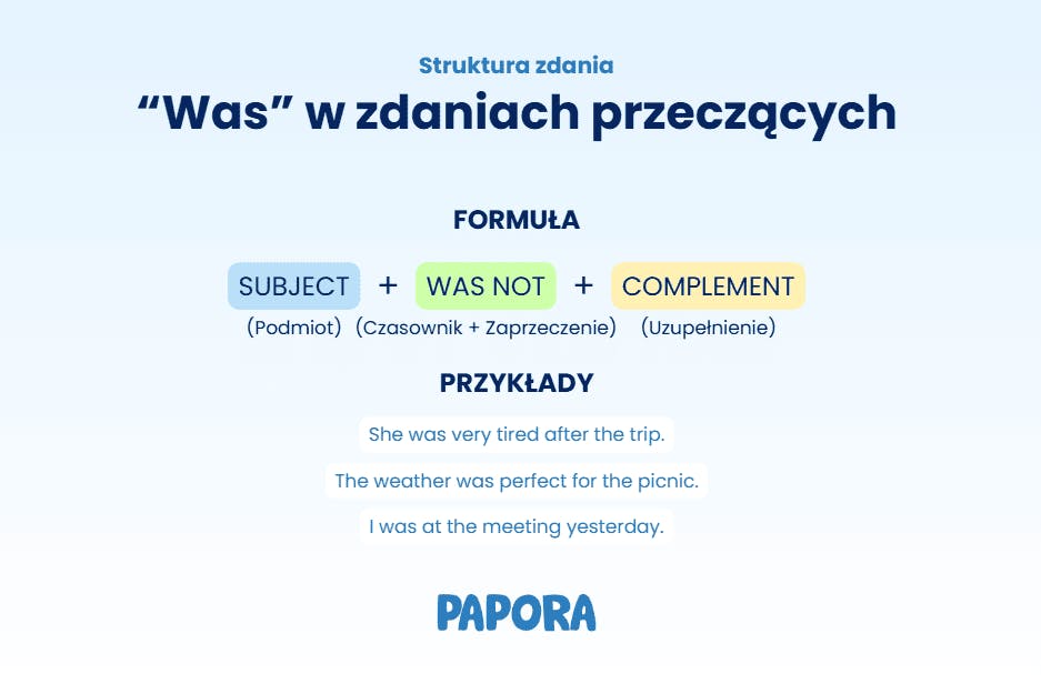 W przypadku powyższej tabeli przedstawiono formę twierdzącą użycia czasownika "was", jednak w przypadku zdań przeczących formuła gramatyczna nie zmienia się tak bardzo: