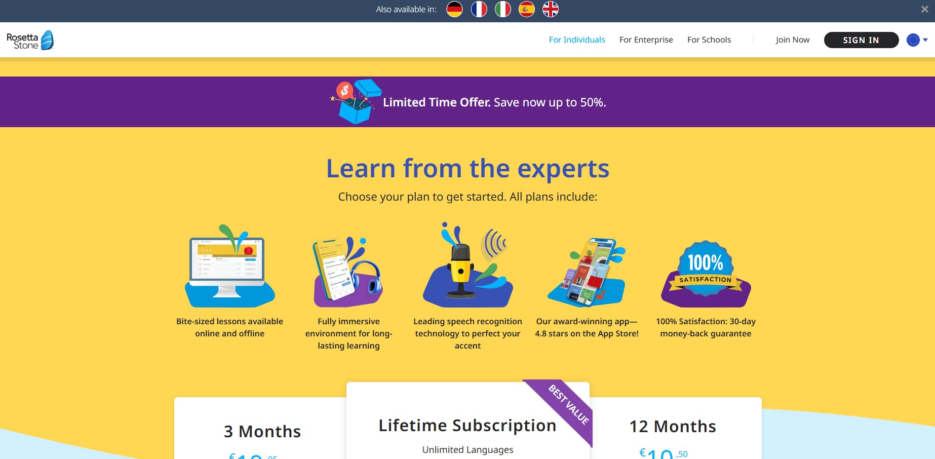 Od momentu wejścia na Rosetta Stone, platforma daje krótkie wprowadzenie do tego, jak działa jej metoda nauki.