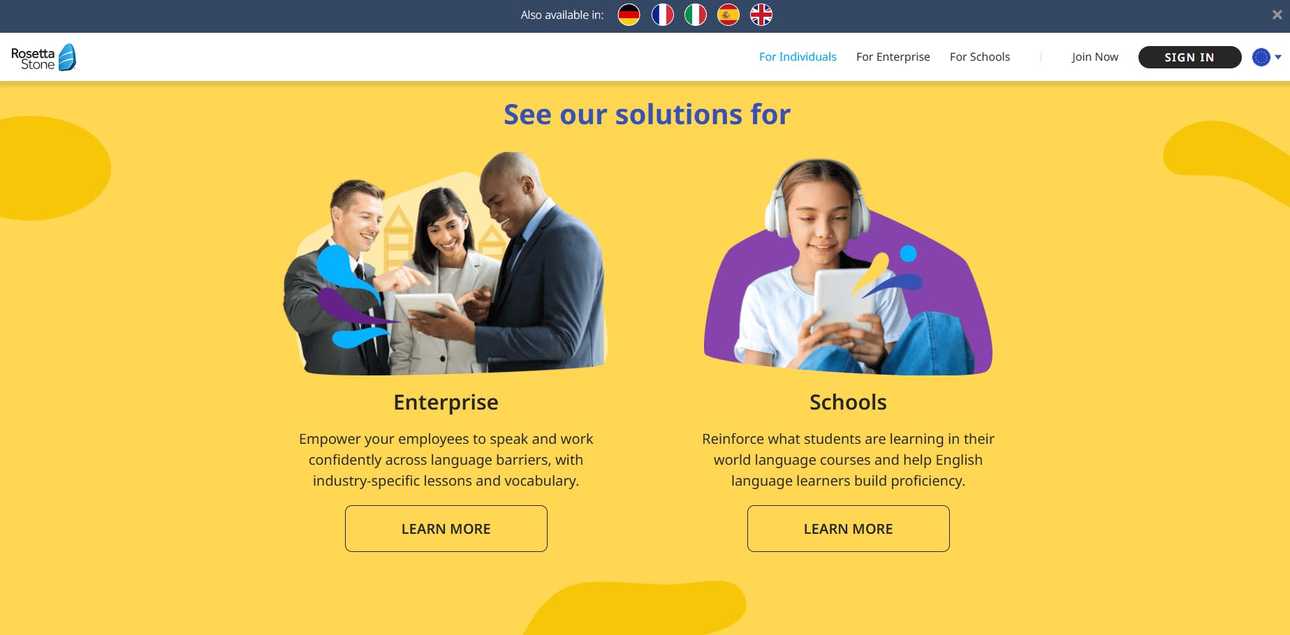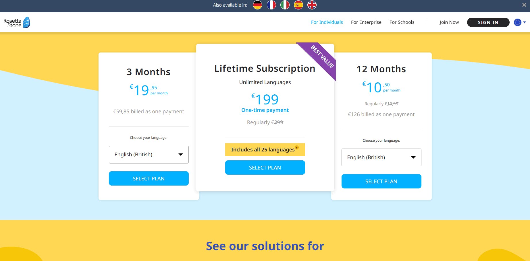 Rosetta Stone oferuje obecnie trzy rodzaje szkoleń: dla osób prywatnych, dla firm i dla szkół. W każdym przypadku dostęp do usługi wymaga uiszczenia opłaty.